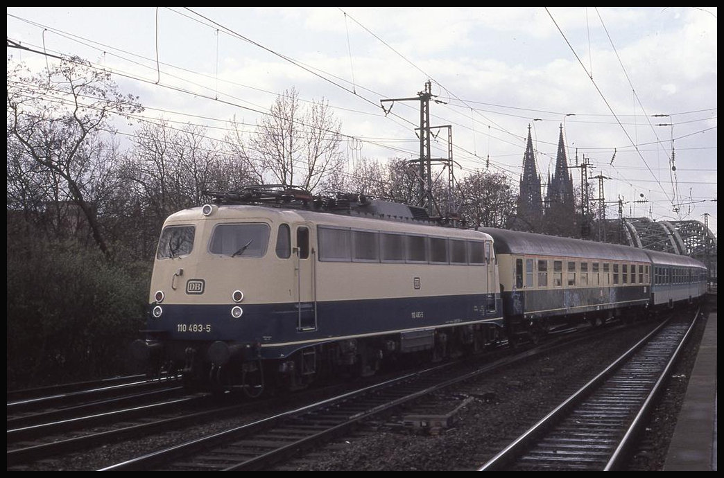 110483 fährt am 25.3.1993 um 14.17 Uhr mit dem E nach Bielefeld in Köln Deutz ein.
