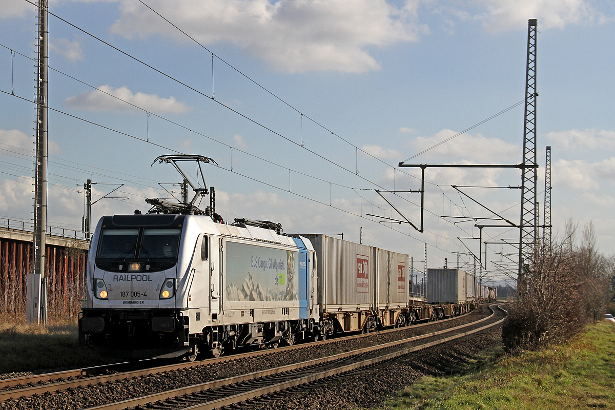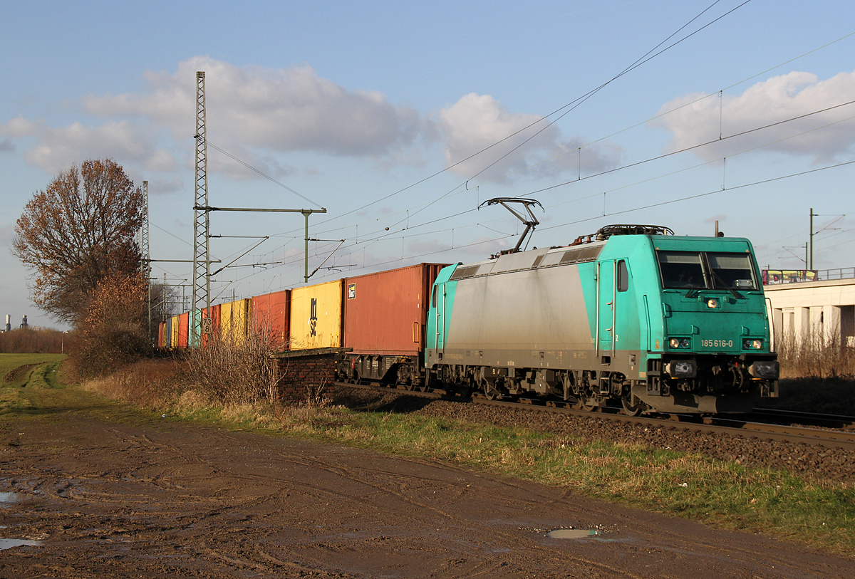 185 166-6 ist mit einen Aufliegerzug in Richtung Süden unterwegs,gesehen am 07.02.2018 bei Würzburg/Süd.