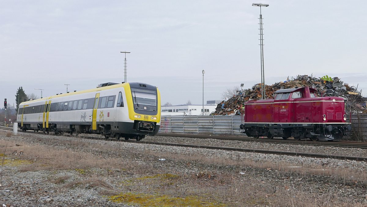 612 551 fährt am 15.01.2018 als RB 22695 von Ulm nach Aulendorf in den Bahnhof von Biberach (Riß) ein und passiert die auf die nächsten Rangierarbeiten wartende 213 332-0.