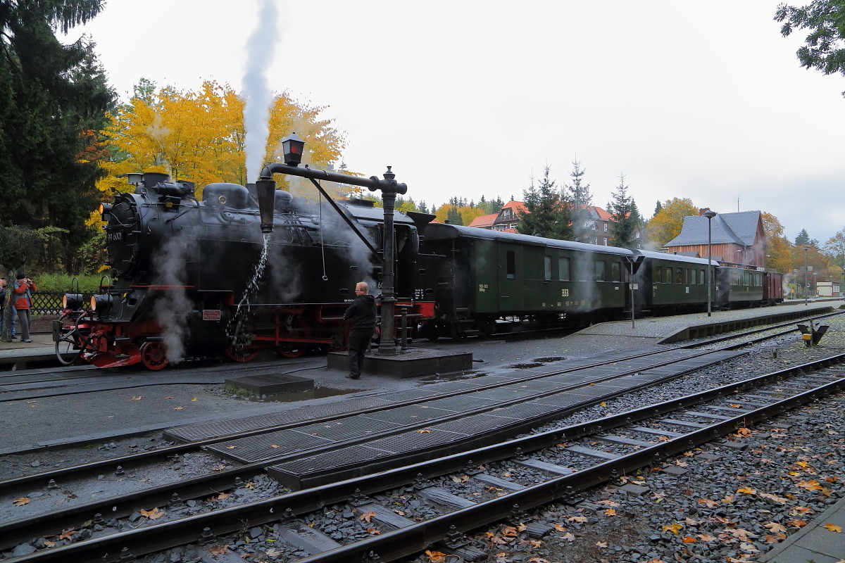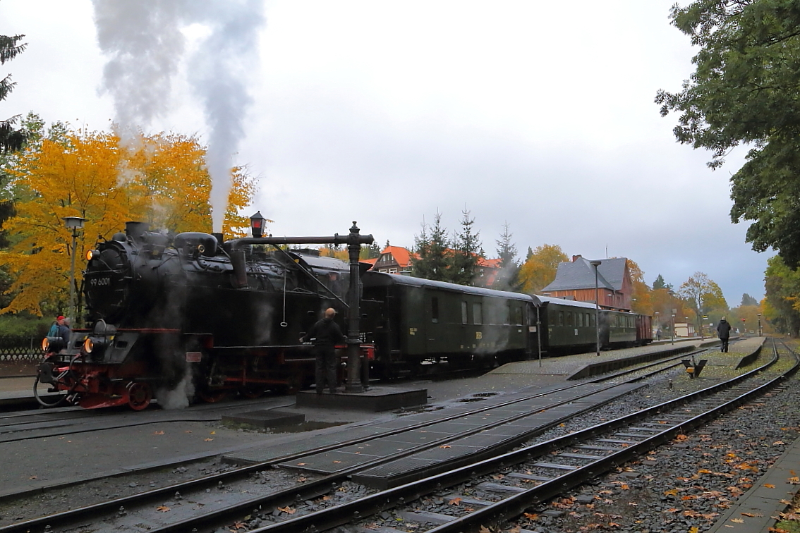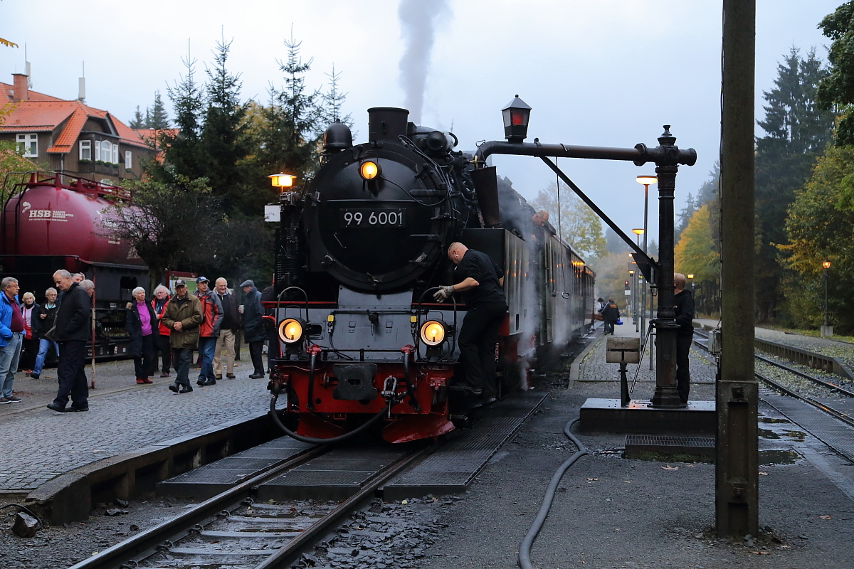 99 6001 mit IG HSB Sonderzug ,am 22.10.2016 unterwegs nach Nordhausen und Quedlinburg, beim Wasserfassen im Bahnhof Drei Annen Hohne.