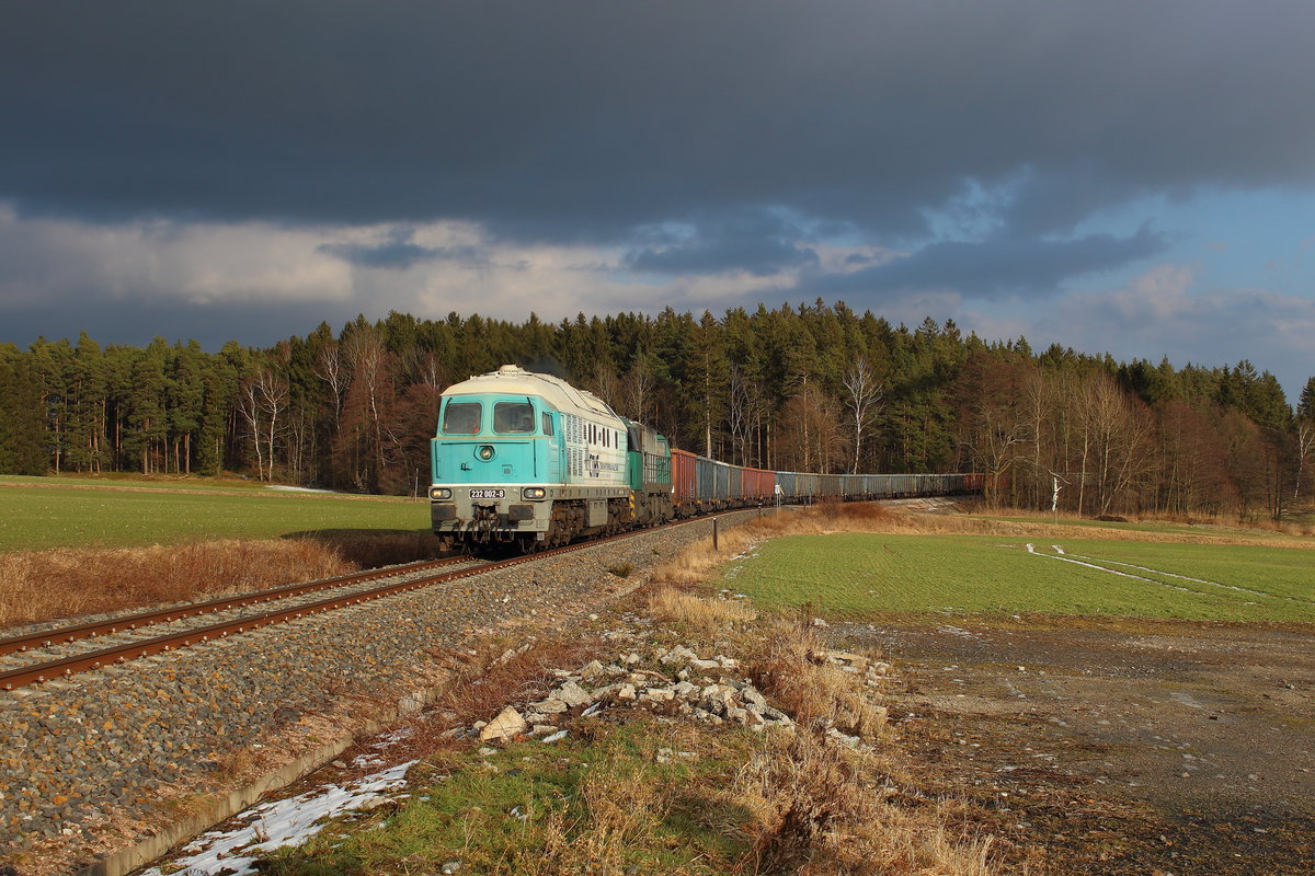 363 518-2 und 363 513-3 zu sehen am 14.02.18 mit einem Holzzug in Chotikov.