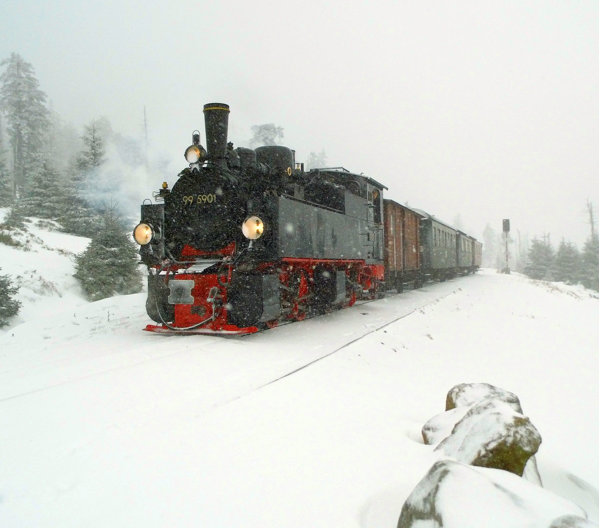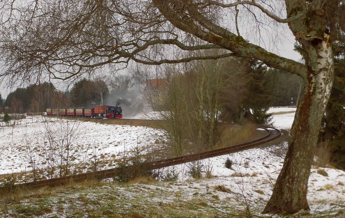 Am 25.02.2017 macht die Lok 99 7232 bei der Ausfahrt aus dem Haltepunkt Sorge mächtig Qualm. Während der Winterdampf-Veranstaltung der IG-HSB gab es dieses Motiv.