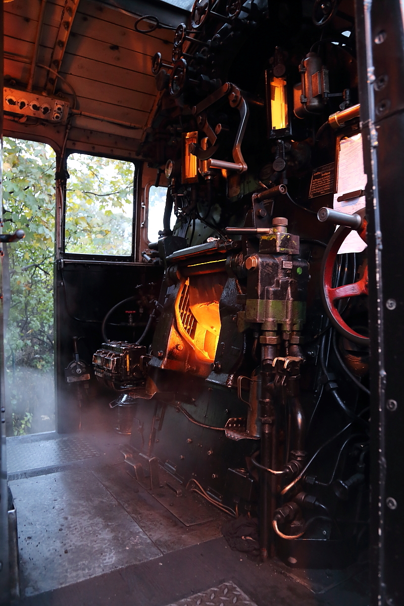 Blick am Morgen des 22.10.2016 in den Führerstand von 99 6001, aufgenommen im Bahnhof Wernigerode. Wie man hier schön sehen kann, hat der Heizer für die anstrengende Bergfahrt mit einem Sonderzug der IG HSB durch den Oberharz für ein ordentliches Feuerchen gesorgt!