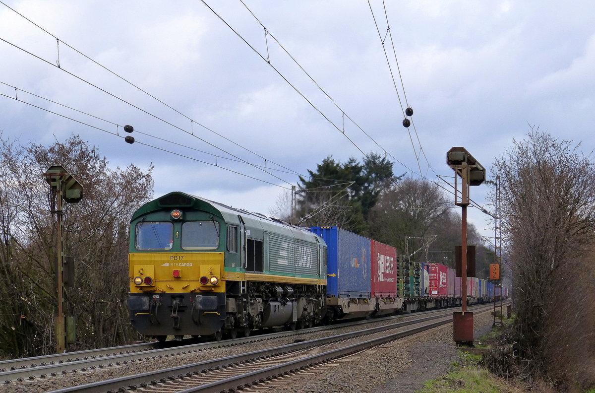 Die Class 66 PB17 von der Rurtalbahn-Cargo kommt aus Richtung Aachen-West und fährt die Gemmenicher-Rampe hoch mit einem langen KLV-Containerzug aus Frankfurt-Höchstadt am Main(D) nach Genk-Goederen(B) und fährt in Richtung Gemmenicher-Tunnel,Botzelaer(B),Gemmenich(B),Nouvelaer(B),Moresnet(B),Moresnet-Chapelle(B),Montzen(B). Aufgenommen an der Montzenroute am Gemmenicher-Weg. Bei Sonne und Wolken am Kalten Nachmittag vom 11.2.2018.