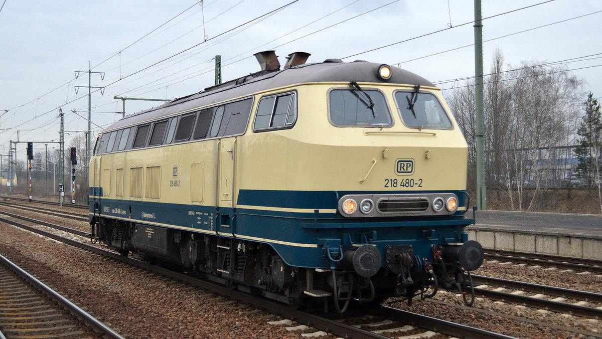 Die schön anzusehende Railsystems RP blau-beige 218 480-2 (9280 1 218 480-2 D-RPRS) am 17.02.18 Bf. Flughafen Berlin-Schönefeld.