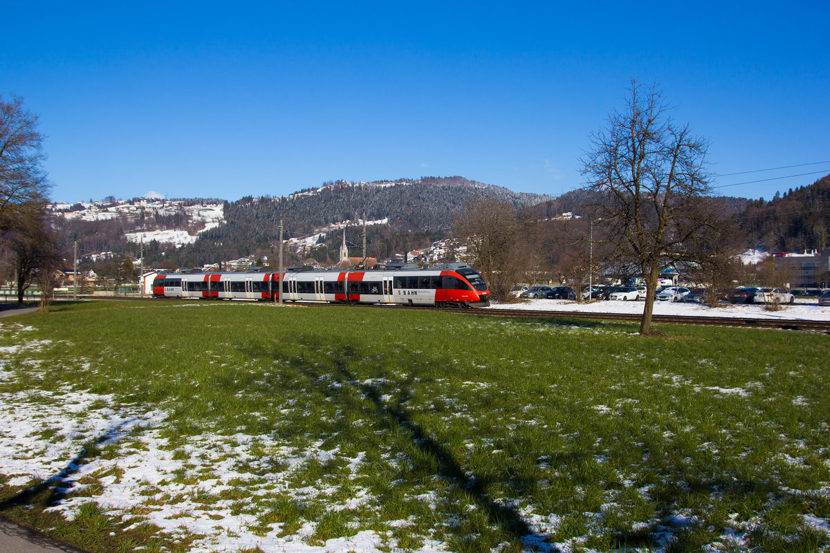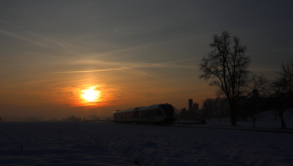 Gestern früh flitzt ein GTW 2/8 an mir vorbei und weg von der Sonne.