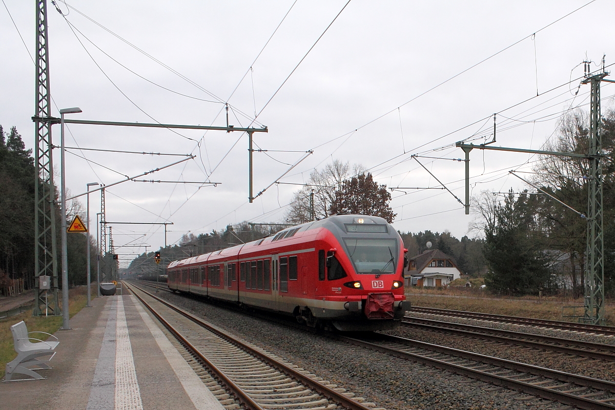 Ein fünfteiliger FLIRT auf der RE 5 als RE 92380 von Oranienburg nach Stralsund Hbf am 17.02.2019 in Nassenheide.