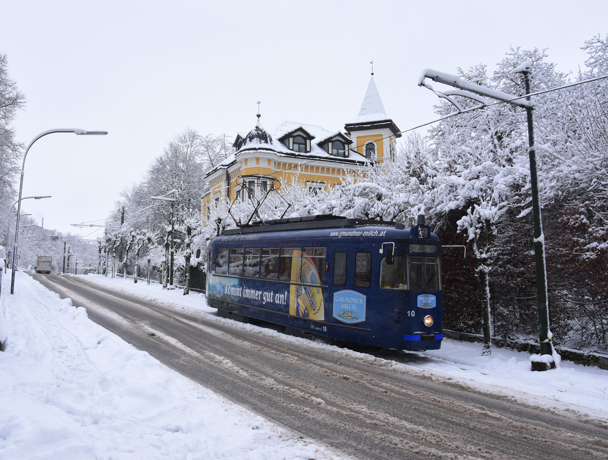 Gmunden GM 10 war am 22.01.2018 bei winterlichen Wetter auf der Straßenbahnstrecke unterwegs und konnte hier in der Alois-Kaltenbrunner-Straße aufgenommen werden.