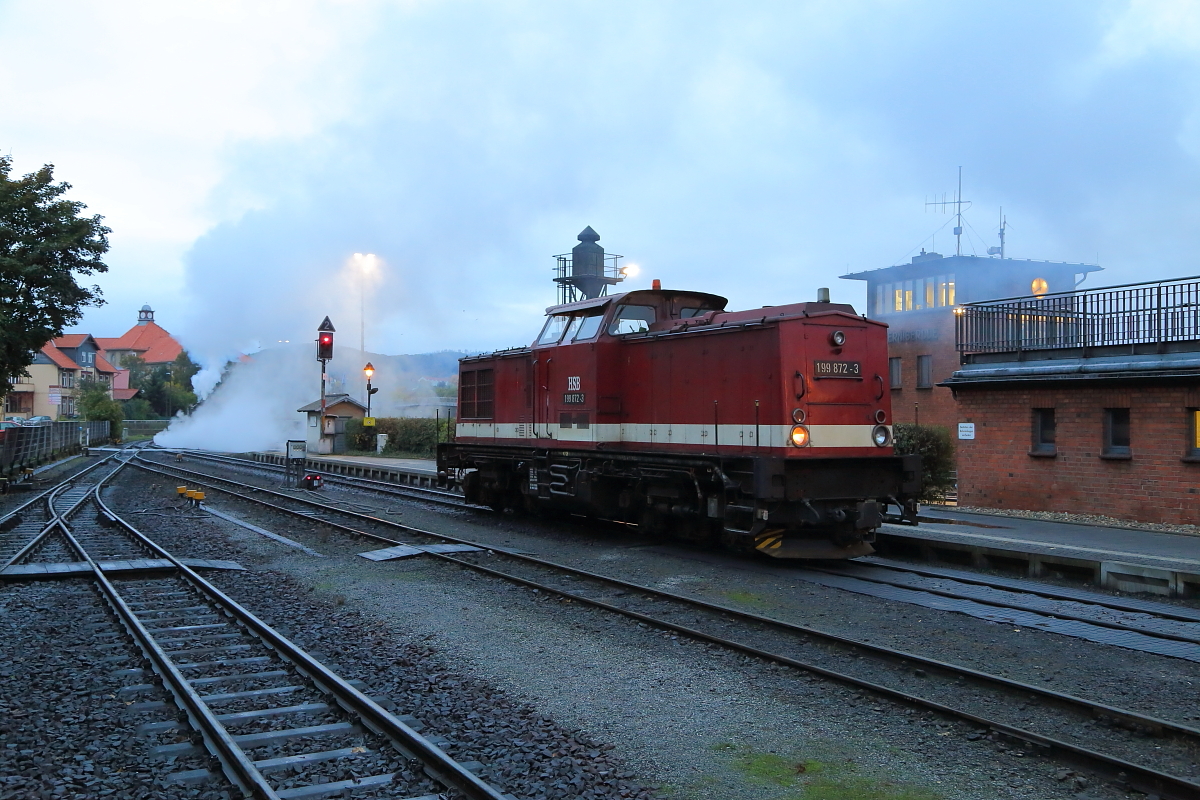 Nachdem sie am Morgen des 22.10.2016 einen Planzug im HSB-Bahnhof Wernigerode bereitgestellt hat, wartet 199 872 auf die Freigabe zur Rangierfahrt. Noch kann es ein wenig dauern, denn hinten befindet sich 99 6001 auf Rangierfahrt, um den im Bahnhof bereitgestellten IG HSB-Sonderzug für die nun zweite Fahrt der dreitägigen Herbstveranstaltung des Vereins zu übernehmen.