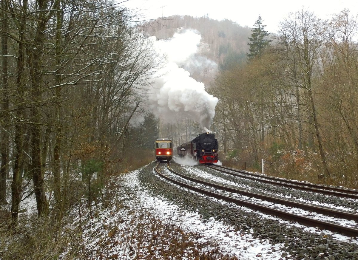 Während der Winterdampf-Veranstaltung der IG-HSB waren wir am 25.02.2017 mit Neubaulok 99 7232,Rollwagen mit aufgerollten G-Wagen und "normalen" Wagenpark von Wernigerode nach Ilfeld und zurück unterwegs. In Eisfelder Talmühle musste für die Doppelausfahrt ein "Fischstäbchen" herhalten.