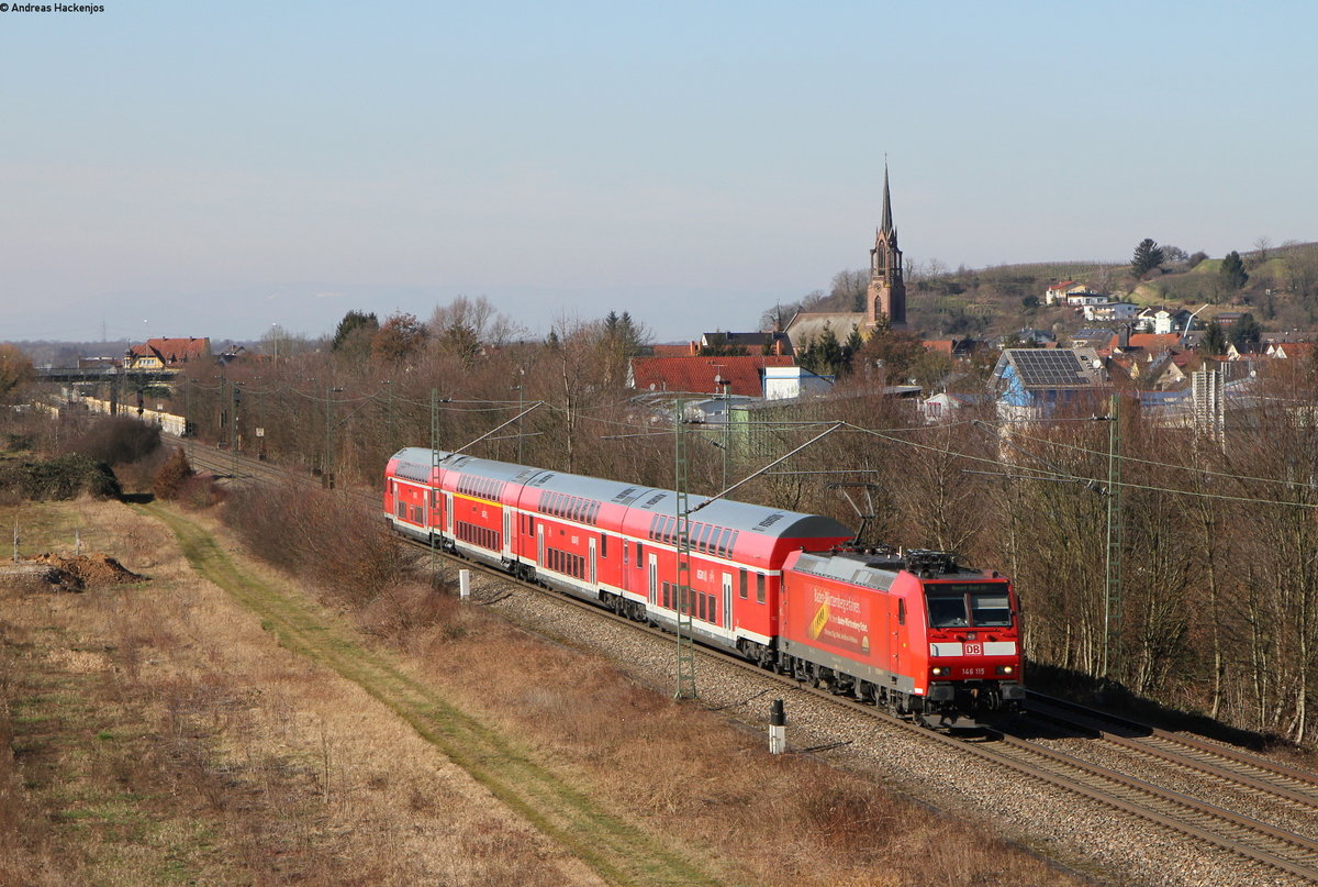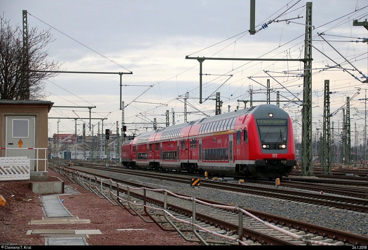 DABpbzfa mit Schublok 146 029 der Elbe-Saale-Bahn (DB Regio Südost) als RE 16325 (RE30) von Magdeburg Hbf nach Halle(Saale)Hbf durchfährt das Gleisvorfeld selbigen Bahnhofs. Aufgenommen von der Delitzscher Straße. [26.1.2018 | 15:45 Uhr]