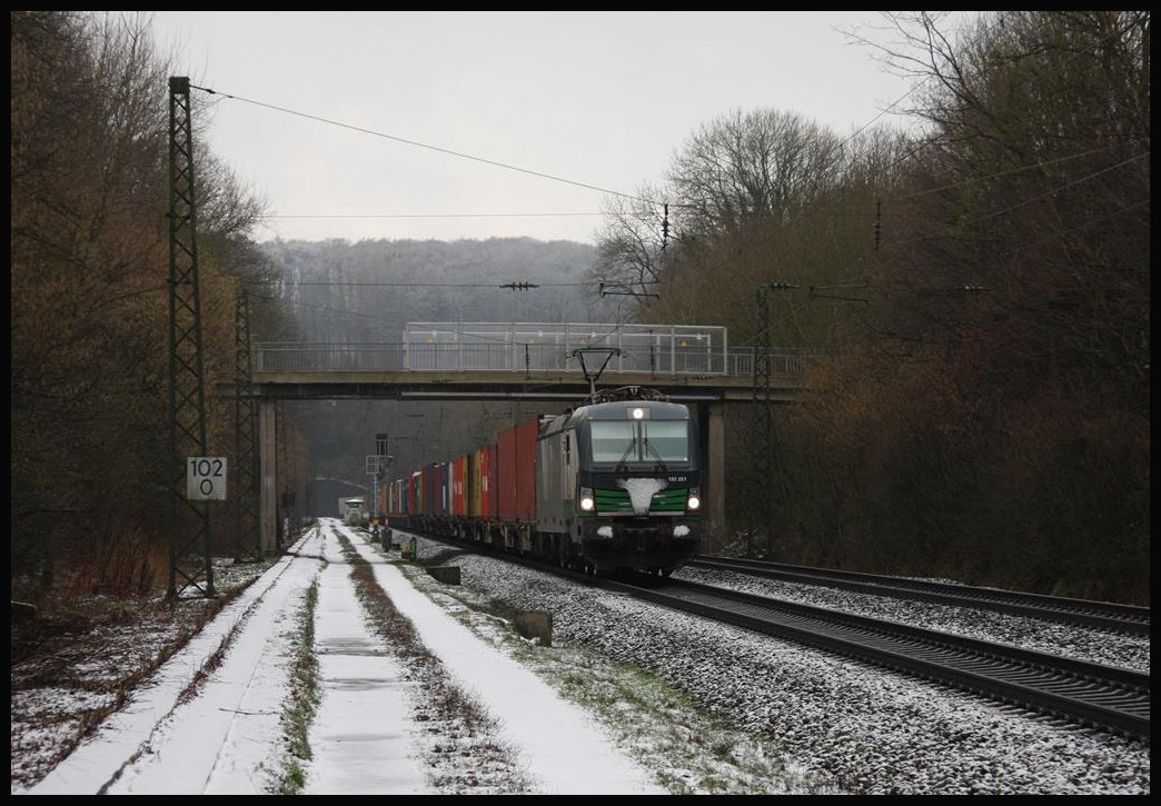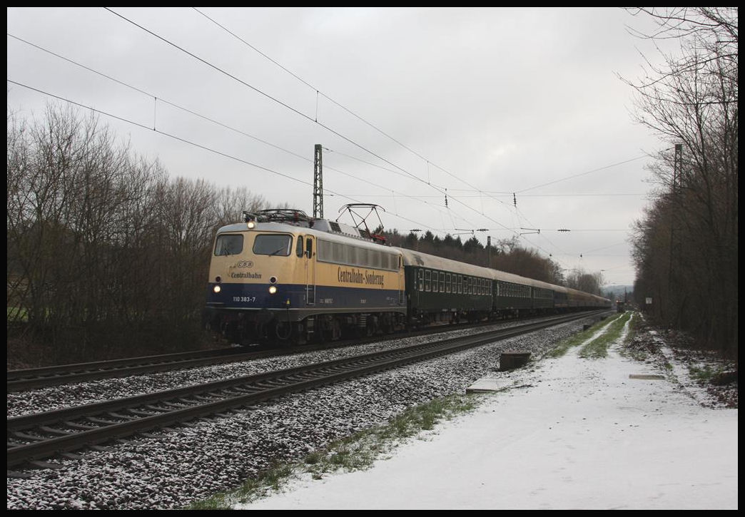 Am 12.02.2018 kam 110383 der Centralbahn mit einem fünfzehn Wagen langen Sonderzug, dem Pappnasen Express aus Hamburg, um 8.31 Uhr durch Lengerich Schollbruch. Der Zug war auf dem Weg nach Köln zum Rosenmontags Karneval.
