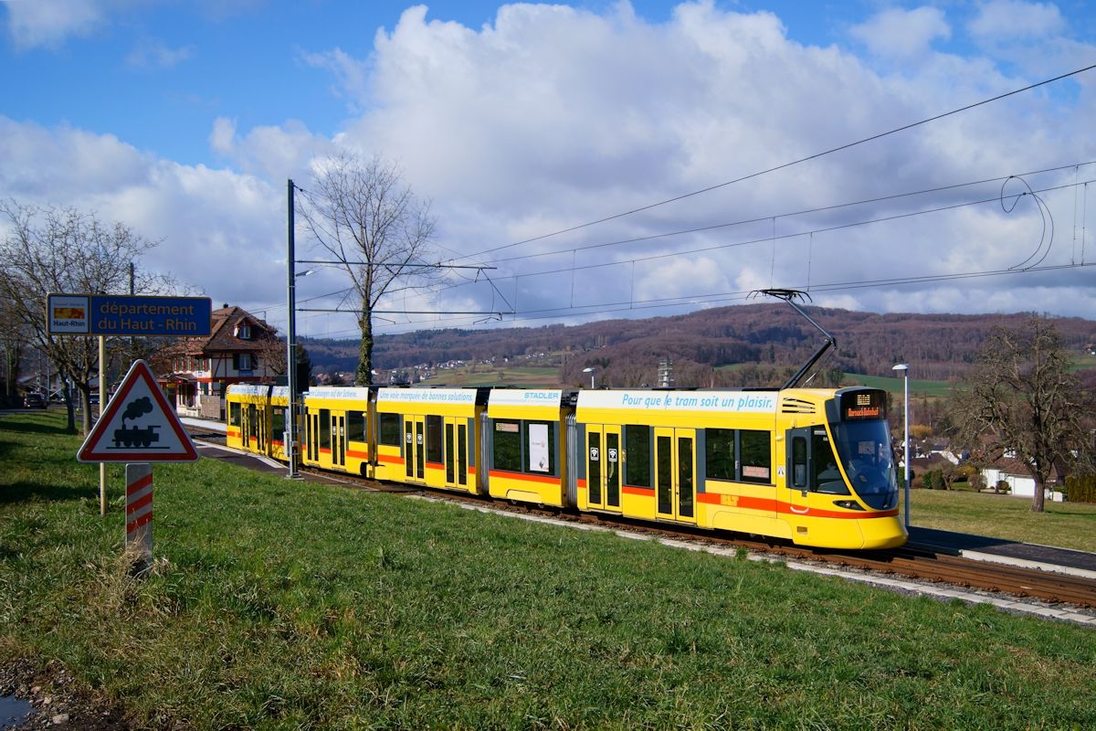 Auf dem Weg von Rodersdorf über Basel nach Dornach verlässt Be 6/10 154 am 12.2.2018 den Bahnhof Leymen in Frankreich. Das Bahnhofsgebäude in Leymen stammt noch aus der Zeit der Birsigthalbahn, welche seit 1986 vollständig ins Basler Tramnetz integriert ist.