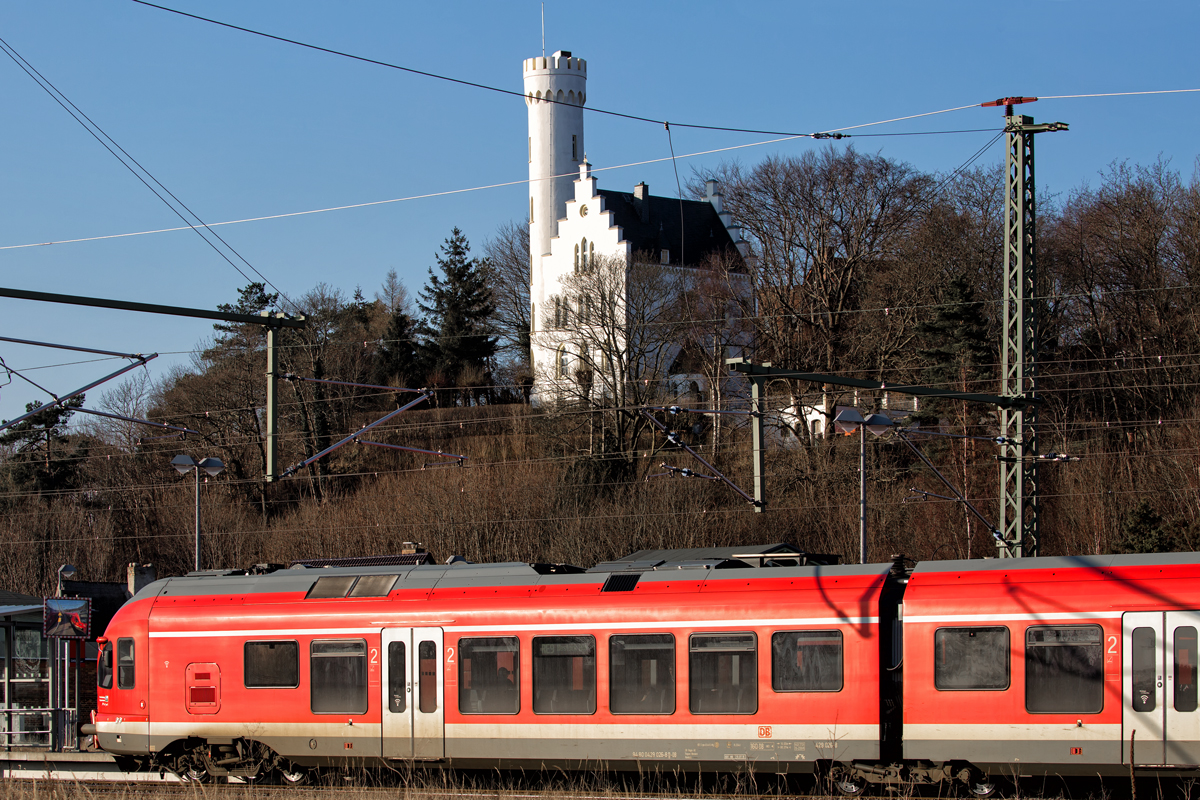 RE 9 nach Stralsund und Binz im Bahnsteigspiegel in Lietzow unterhalb des gleichnamigen Schlosses. - 20.02.2018