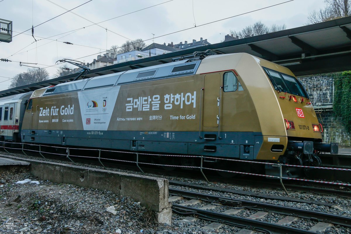 101 071 "Zeit für Gold" mit IC2229 in Wuppertal Hbf, am 20.02.2018.