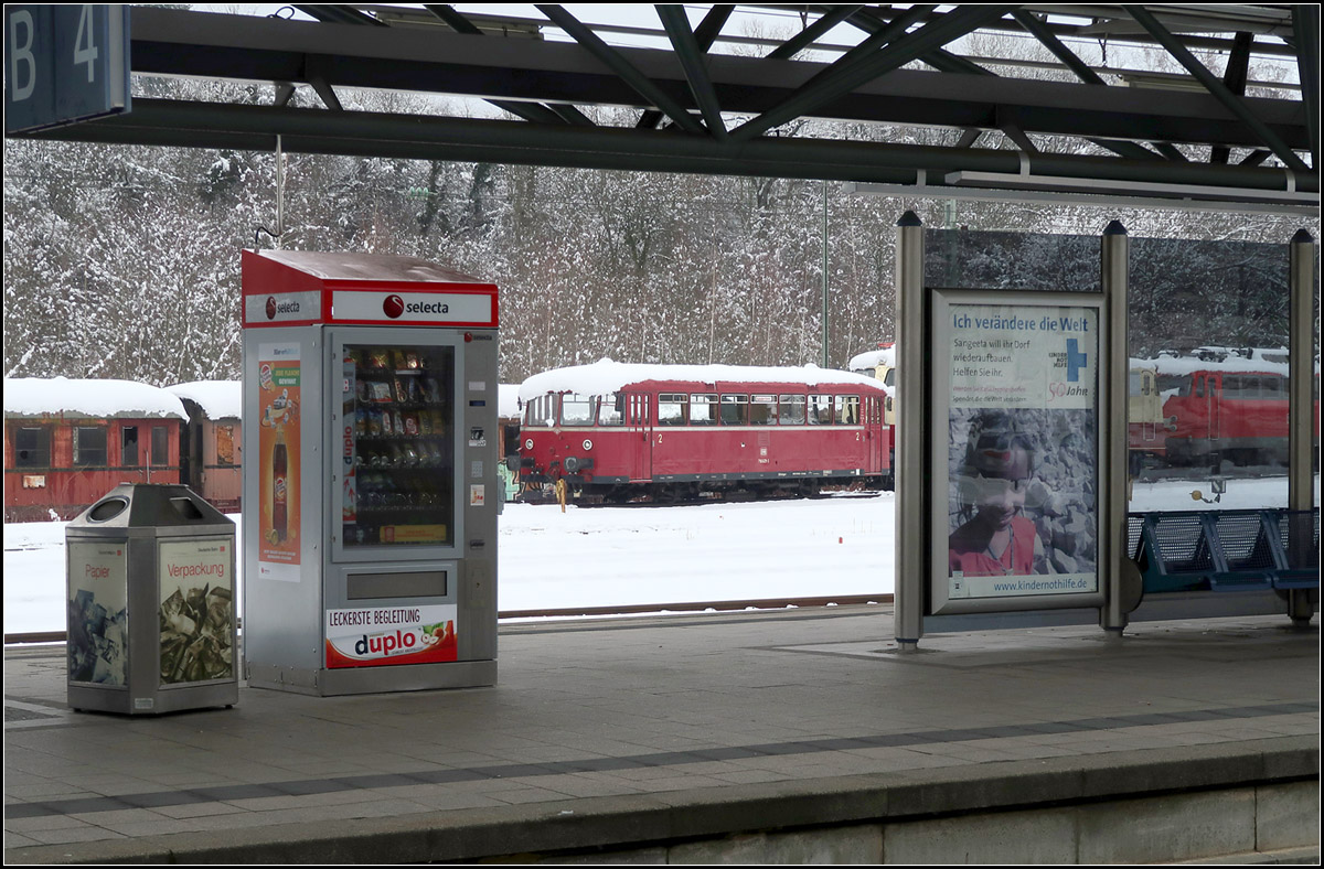 Die Bahnsteig-Accessoires mit der Dachkonstruktion sind sehr heutig während die Züge im Hintergrund früher mal ihre Zeit hatten.