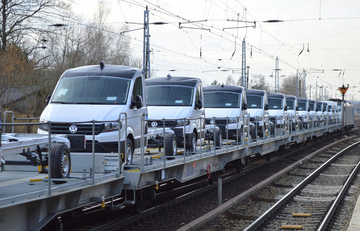 Belgische Flachwageneinheiten der Fa. BLG AUTORAIL für Fahrzeug-Transporte der Wagengattung Laadgrs beladen mit fabrikneuen VW Crafter Transportern aus polnischer Produktion gezogen von 186 436-2 (für HSL tätig) am 21.02.18 Berlin-Hirschgarten.