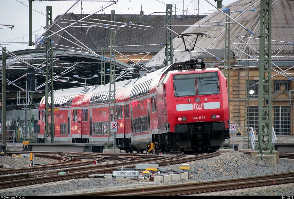 Nachschuss auf 146 029 der Elbe-Saale-Bahn (DB Regio Südost) als RE 16325 (RE30) von Magdeburg Hbf, der seinen Endbahnhof erreicht. Aufgenommen von der Delitzscher Straße. [26.1.2018 | 15:45 Uhr]