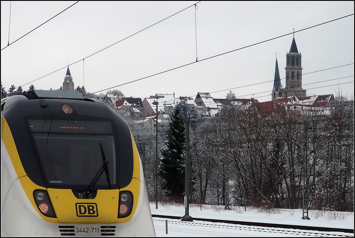 Obwohl der Talent 2 3422-211 vor meinem IC im Stuttgarter Hauptbahnhof losfuhr, war ich schneller in Rottweil und so konnte ich in dort bei der Einfahrt wieder fotografieren. Unterwegs hatte ich die Hoffnung beim Überholen vielleicht ein Spiegelbild machen zu können. Aber er war nirgends zu sehen. Vermutlich wurde er durch einen entgegenkommenden IC2-Zug in Oberndorf (Neckar) verdeckt.