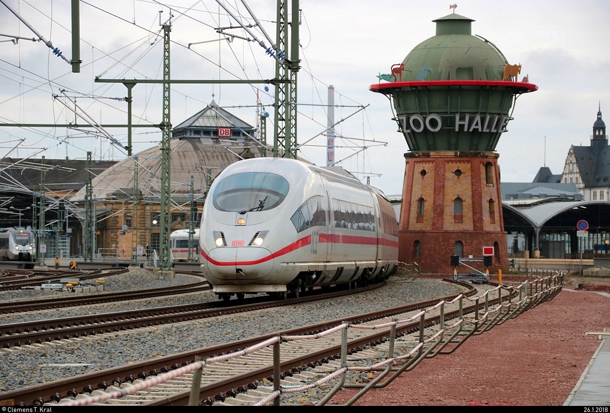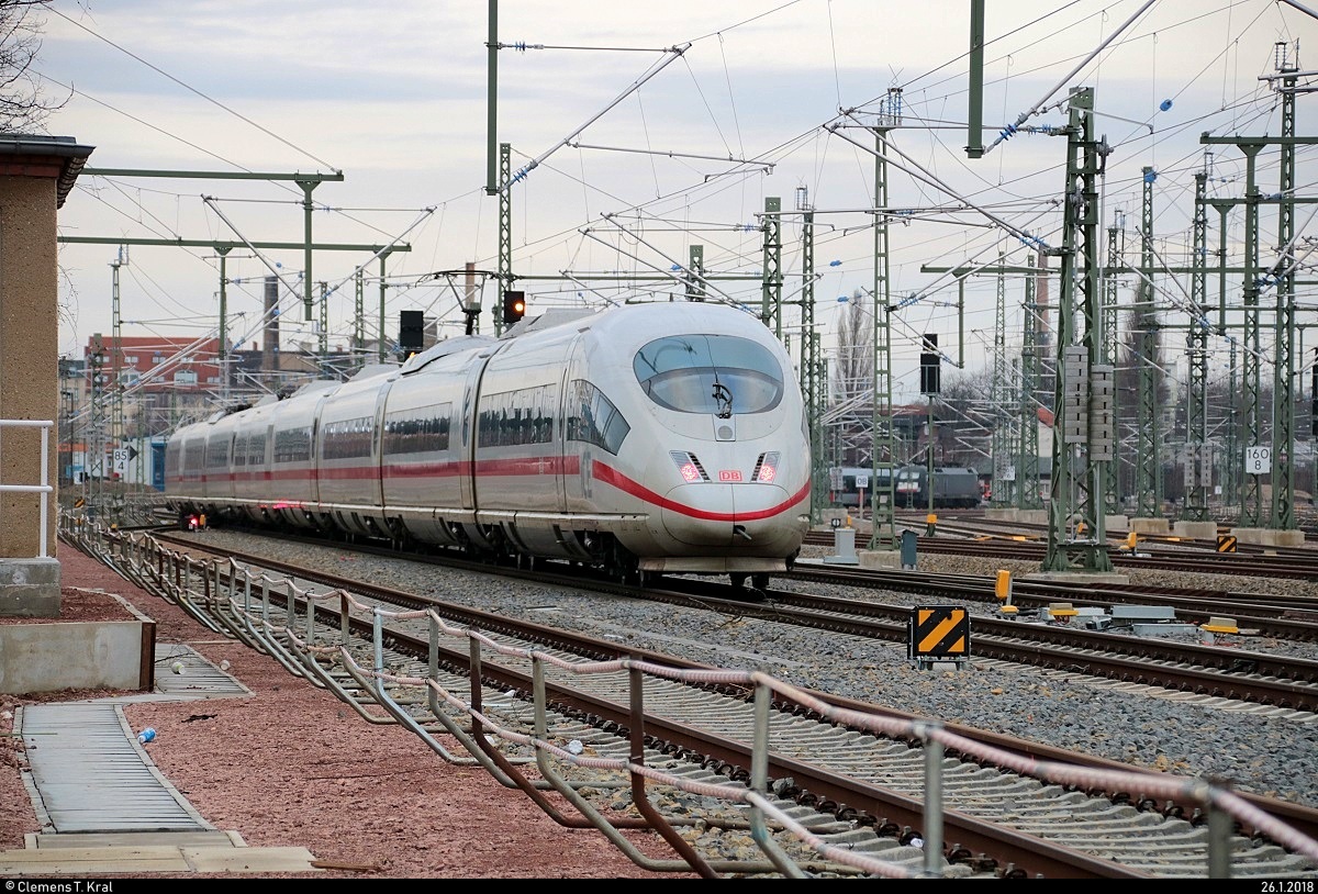 Nachschuss auf eine BR 403 als ICE 1539 (Linie 15) von Frankfurt(Main)Hbf nach Berlin Hbf (tief), die das Gleisvorfeld von Halle(Saale)Hbf durchfährt. Aufgenommen von der Delitzscher Straße. [26.1.2018 | 15:49 Uhr]