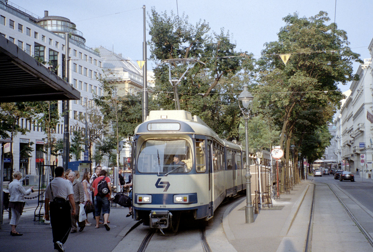 Wiener Lokalbahn Gelenktriebwagen 4-119 I, Innere Stadt, Kärntner Ring / Kärntner Straße / Oper am 5. August 2010. - Scan eines Farbnegativs. Film: Kodak FB 200-7. Kamera: Leica C2.