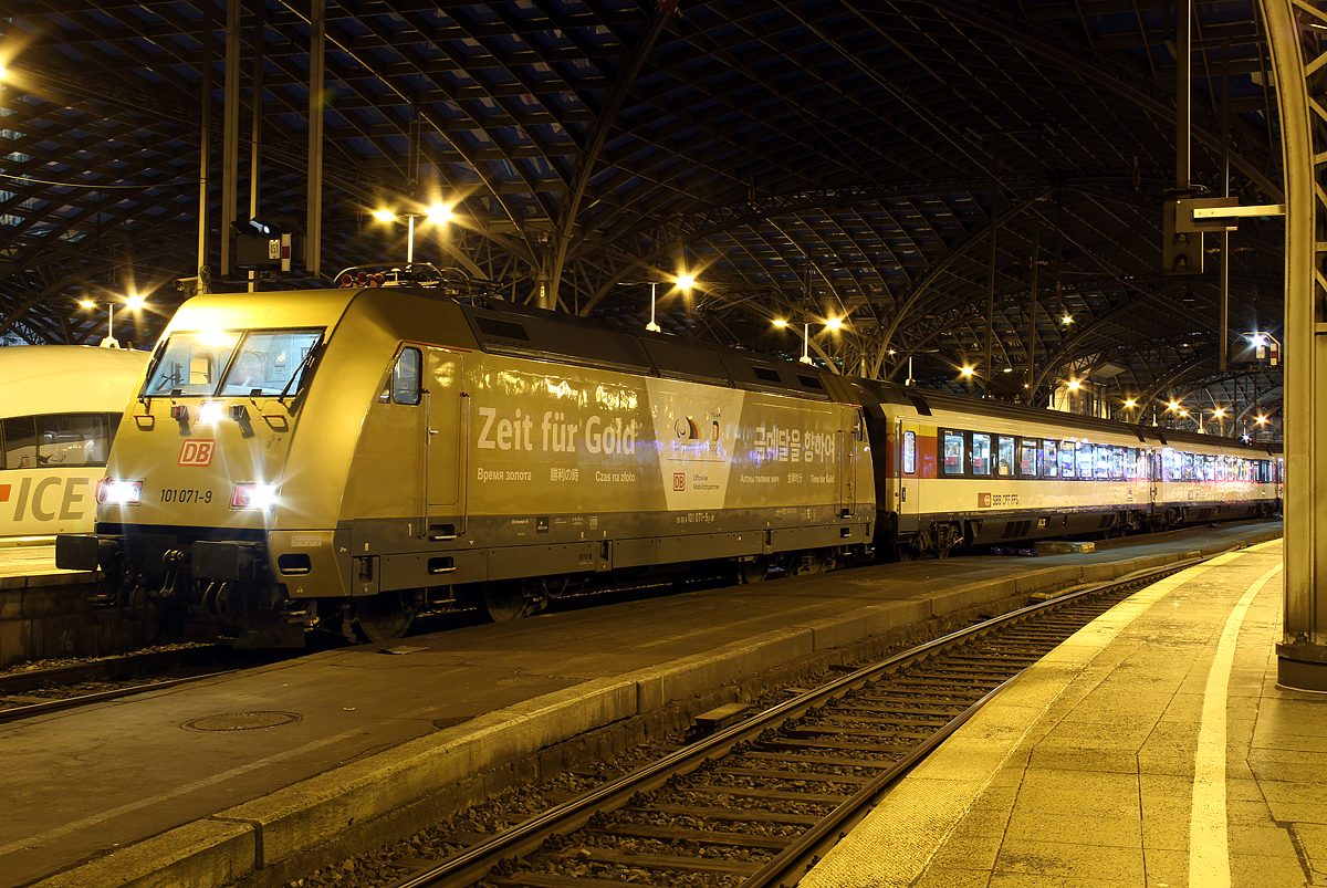 101 071  Zeit für Gold  am EC6 nach HH-Altona in Köln Hbf am 22.02.2018