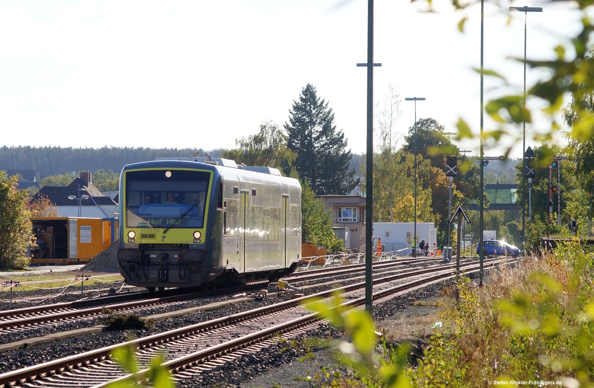 Bahnhof Rehau während der signaltechnischen Umstellung. Wir sehen dass schon neue Technik aufgestellt ist, aber die Formsignale noch im Einsatz. Es kann sich hier nur noch um Tage handeln...Foto vom 28.09.2015. Heute sind die Formsignale Geschichte, das kl. Stellwerk ist auch abgerissen, die neue Technik wohnt in einem Betonfertigteil-Kasten...