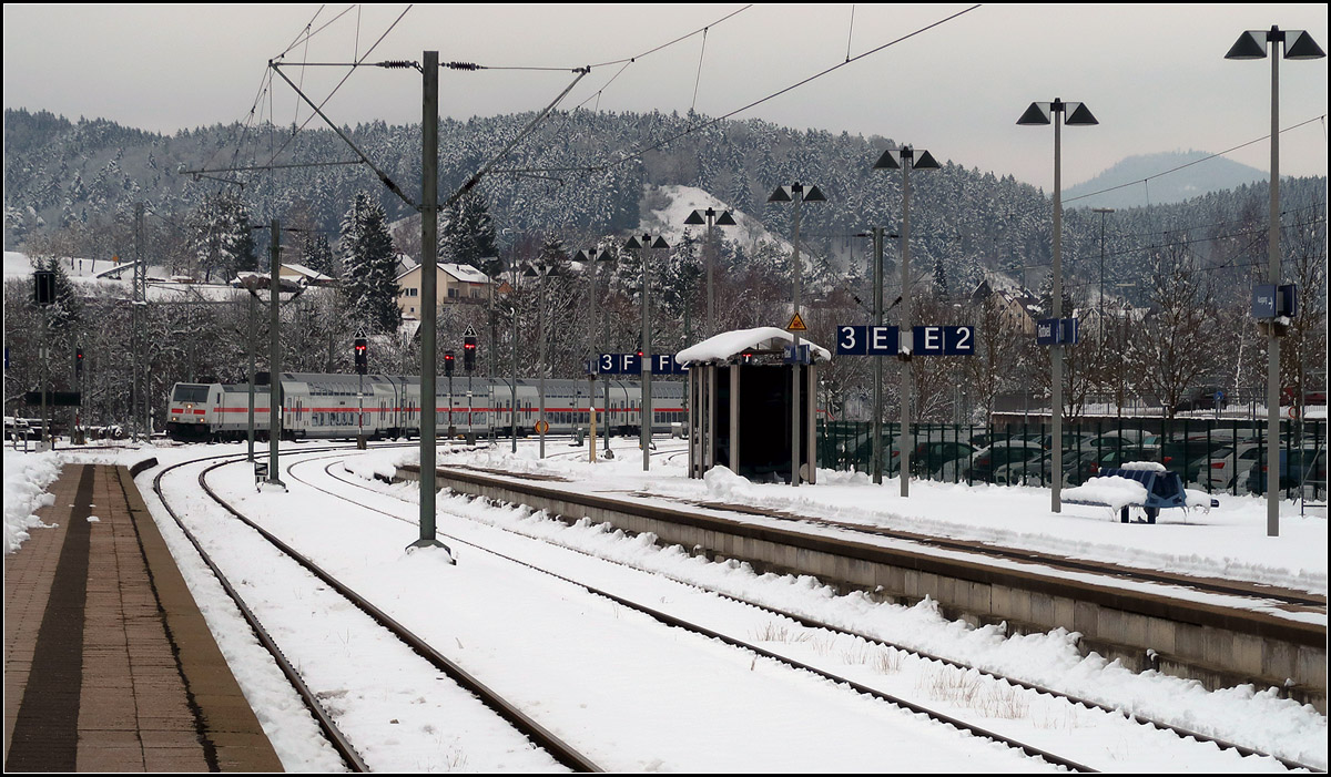 Bahnhof Rottweil. Der IC2-Zug hebt sich farblich kaum vom winterlichen Umfeld ab.