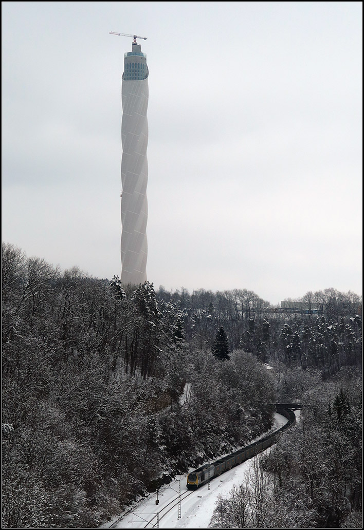 Da wirkt auch der Güterzug recht klein - Blick ins Neckartal in Rottweil mit durchfahrendem Güterzug und dem eigenwilligen Aufzugstestturm im Hintergrund. 19.02.2018 (M)