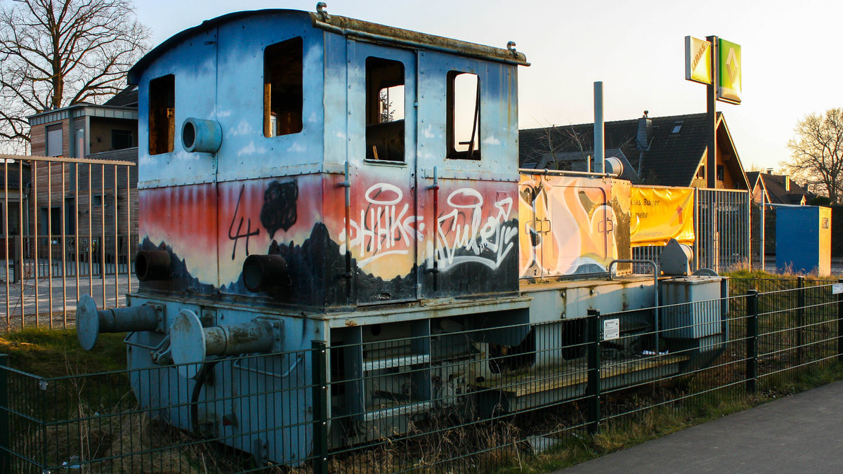 Deutz-Rangierlock - von der Seite |  Die Lokomotive wurde 1952 in Köln von der Firma Klöckner-Humboldt-Deutz, dem Vorläufer der Deutz AG, gebaut. Seit Herbst 2011 hat sie am Alleenradweg einen neuen Standort gefunden und erhielt hier 2012 durch zwei Sprayer ein farbenfrohes Outfit. - Leihgeber: Halle 31, Nutzfahrzeugmuseum Willich ; Leistung: 120 PS ; Gewicht: 22t ; Motor: Sechszylinder-Dieselmotor   | 21.02.2018