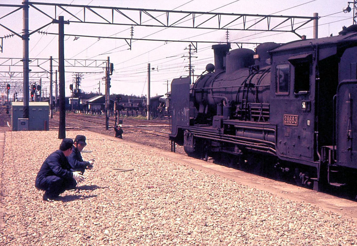 Die japanische Dampflok Serie 8620: Nr. 2-8683 wartet in Higashi Noshiro auf Abfahrt über die einsame Nebenlinie in den äussersten Nordwesten der japanischen Hauptinsel. Lokführer und Heizer machen es sich neben der Lok bei einem Schwatz gemütlich. 3.Mai 1972.