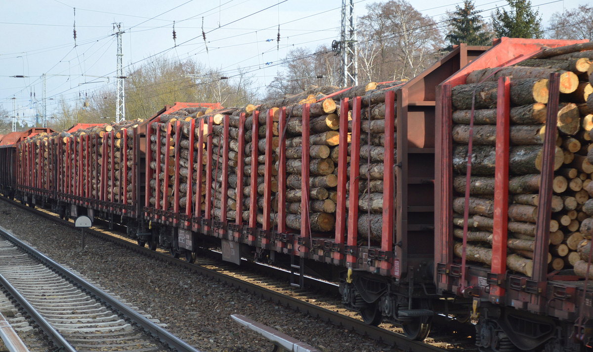 Drehgestell-Flachwagen für den Holztransport der DB mit der Nr. 37 RIV 80 D-DBSNI 3525 703-9 Roos-t 645 am 19.02.18 Berlin-Hirschgarten.