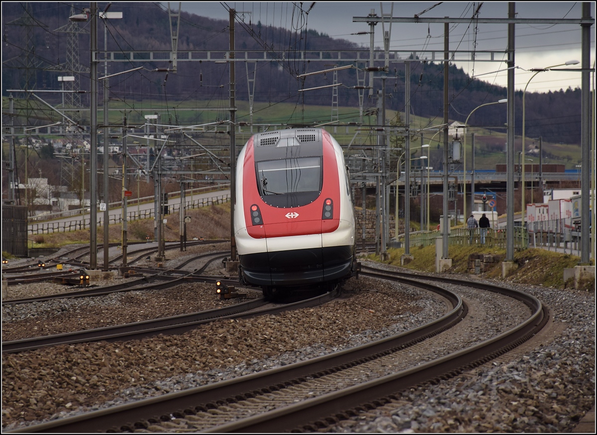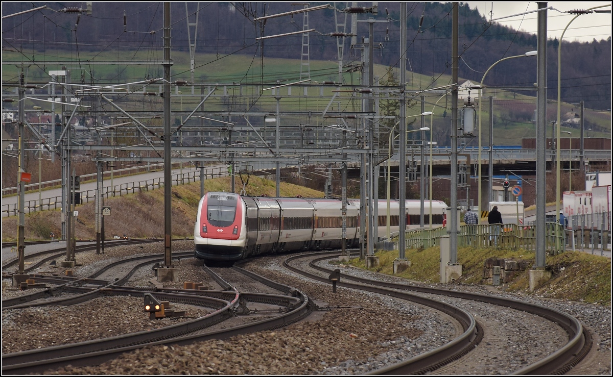 ICN RABDe 500 015 "Jean-Jacques Rousseau" fährt durch Lausen Richtung Olten. Interessant ist die Gleisführung, die hier auf schnelle Durchfahrten getrimmt ist. Dezember 2017.