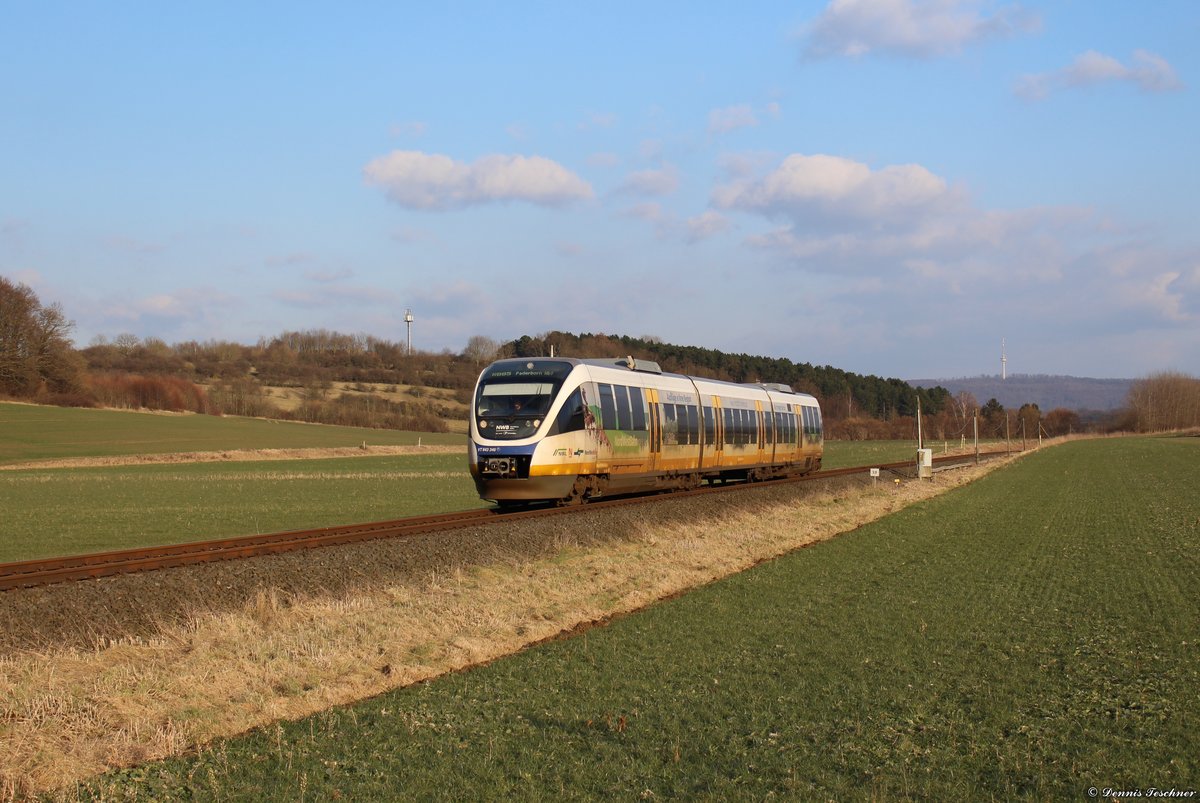 Kurz nach Arbeitsende machte ich mich bei sonnigem Wetter auf den Weg an die KBS 356 (Strecke Göttingen-Bodenfelde). Ich bin mittlerweile ein Fan dieser VT 643 geworden, muss ich gestehen! Dies wird wahrscheinlich auch daran liegen das diese auf der eingleisigen Dieselstrecke zwischen dem Solling und Göttingen einfach toll aussehen. Freuen durfte ich mich über die 643 346 die mit einer Vollwerbung (Ausflüge in Ihrer Region - www.frischluft-tanken.de) als RB 85 von Göttingen nach Paderborn unterwegs war. 643 346 NWB als RB 85 bei Lenglern am 22.02.2018