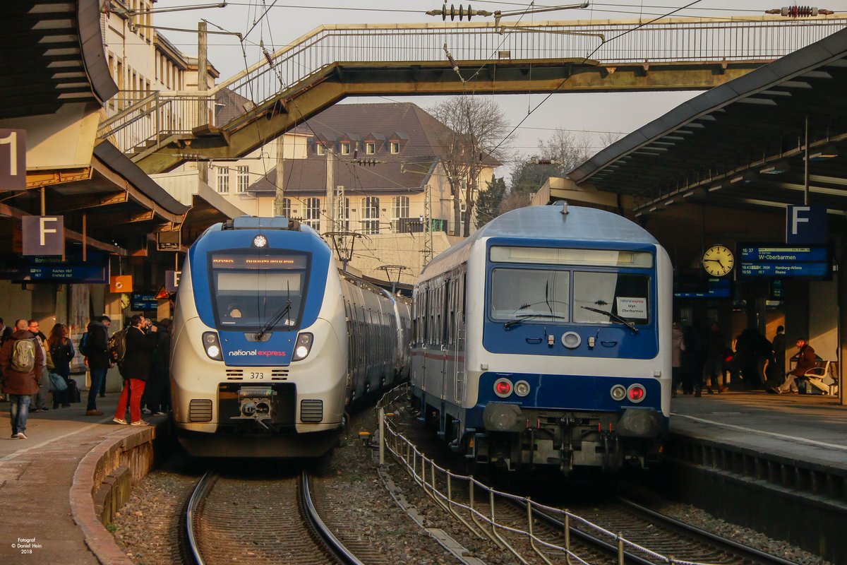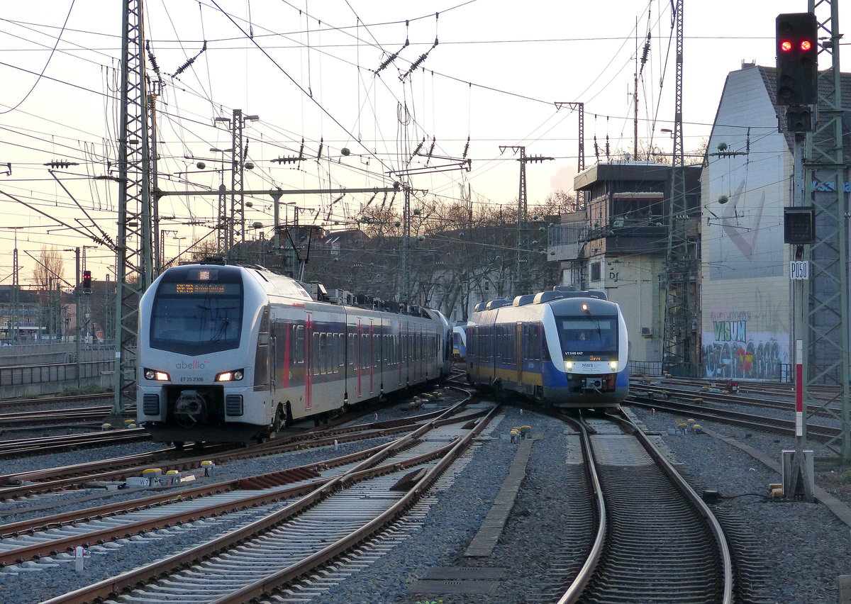 Zwei Züge fahren in Düsseldorf-Hbf ein. Aufgenommen vom Bahnsteig 5 in Düsseldorf-Hbf. In der Abendstimmung am Abend vom 13.2.2018.