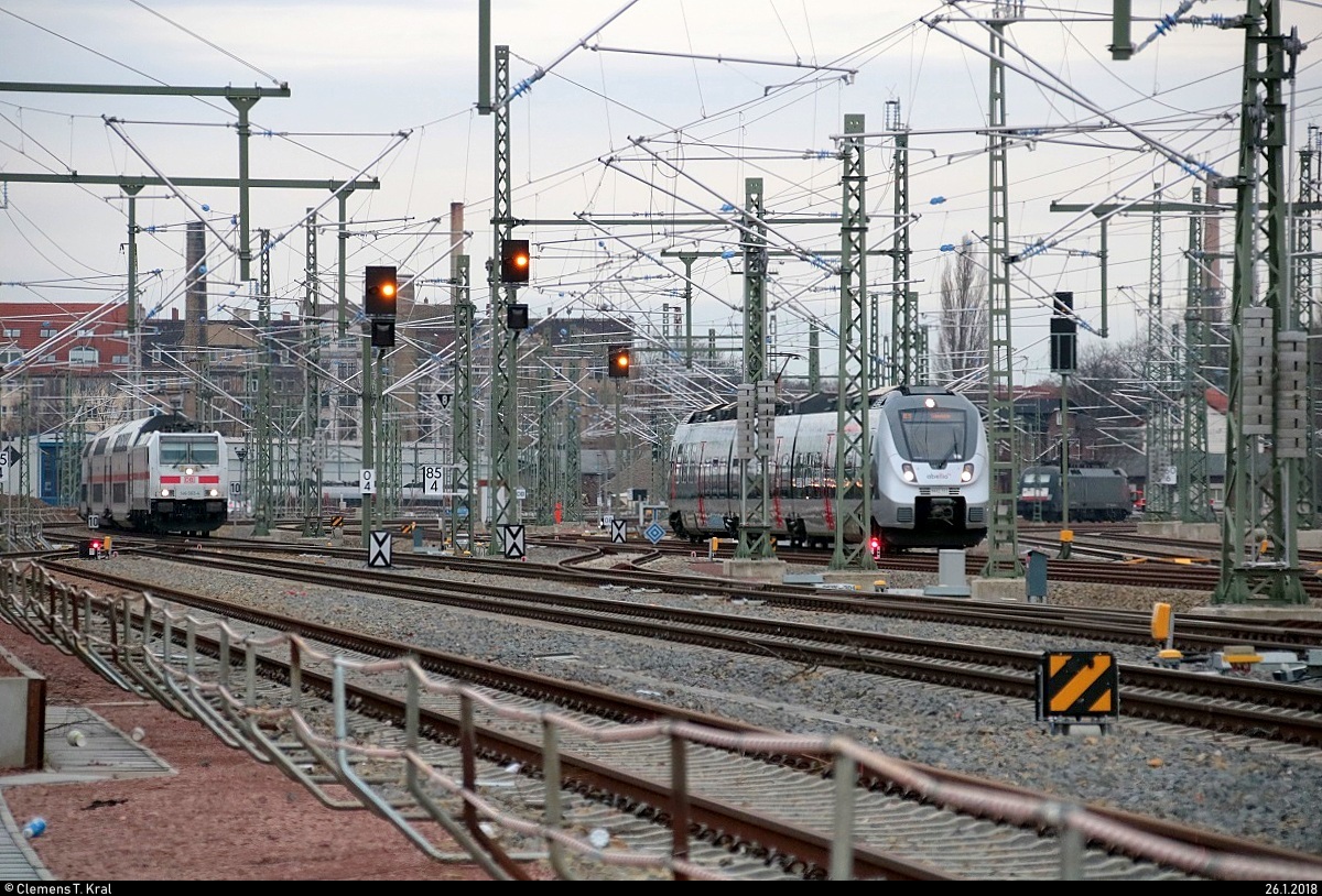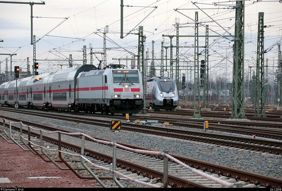 Paralleleinfahrt im Gleisvorfeld von Halle(Saale)Hbf... 146 562-4 DB als IC 2039 (Linie 56) von Norddeich Mole nach Leipzig Hbf scheint das Rennen gegen 9442 117 (Bombardier Talent 2) von Abellio Rail Mitteldeutschland, der bereitgestellt wird, zu gewinnen. Aufgenommen von der Delitzscher Straße. [26.1.2018 | 15:55 Uhr]