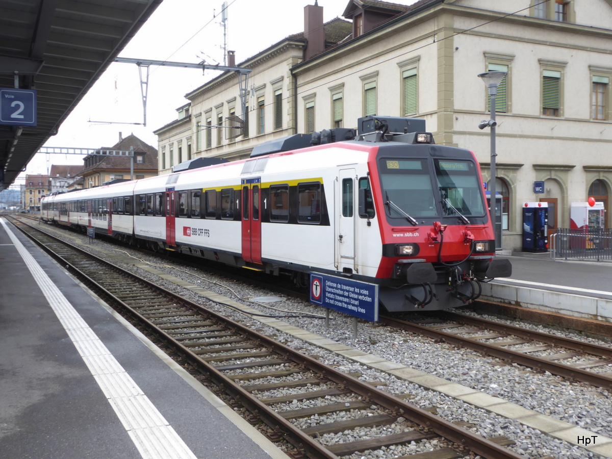 SBB - Steuerwagen ABt 50 85 39-43 836-8 an der Spitze eines Regio nach Fribourg im Bahnhof von Payerne am 10.02.2018