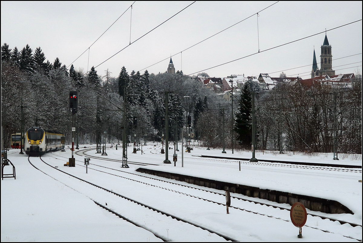 Unterhalb der Altstadt und unter der Schneedecke - ... liegen die Gleise des Bahnhofes Rastatt mit einem einfahrenden Talent 2 aus Stuttgart. 19.02.2018 (M)