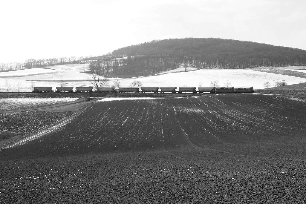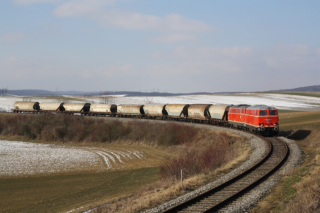 2143.56 und 2143 070 vom Verein Neue Landesbahn am 25.2.2018 mit einem leeren Getreidezug von Korneuburg nach Ernstbrunn unterwegs, aufgenommen kurz nach Mollmannsdorf am Schareiterberg, der fälschlicherweise oft auch als Mollmannsdorfer Berg bezeichnet wird, und der eine Steigung von bis zu 27 %o aufweist. Ich hab mir jetzt alle Mühe gegeben, das Bild sehr genau auszurichten, damit man die Steigung schön sehen kann.