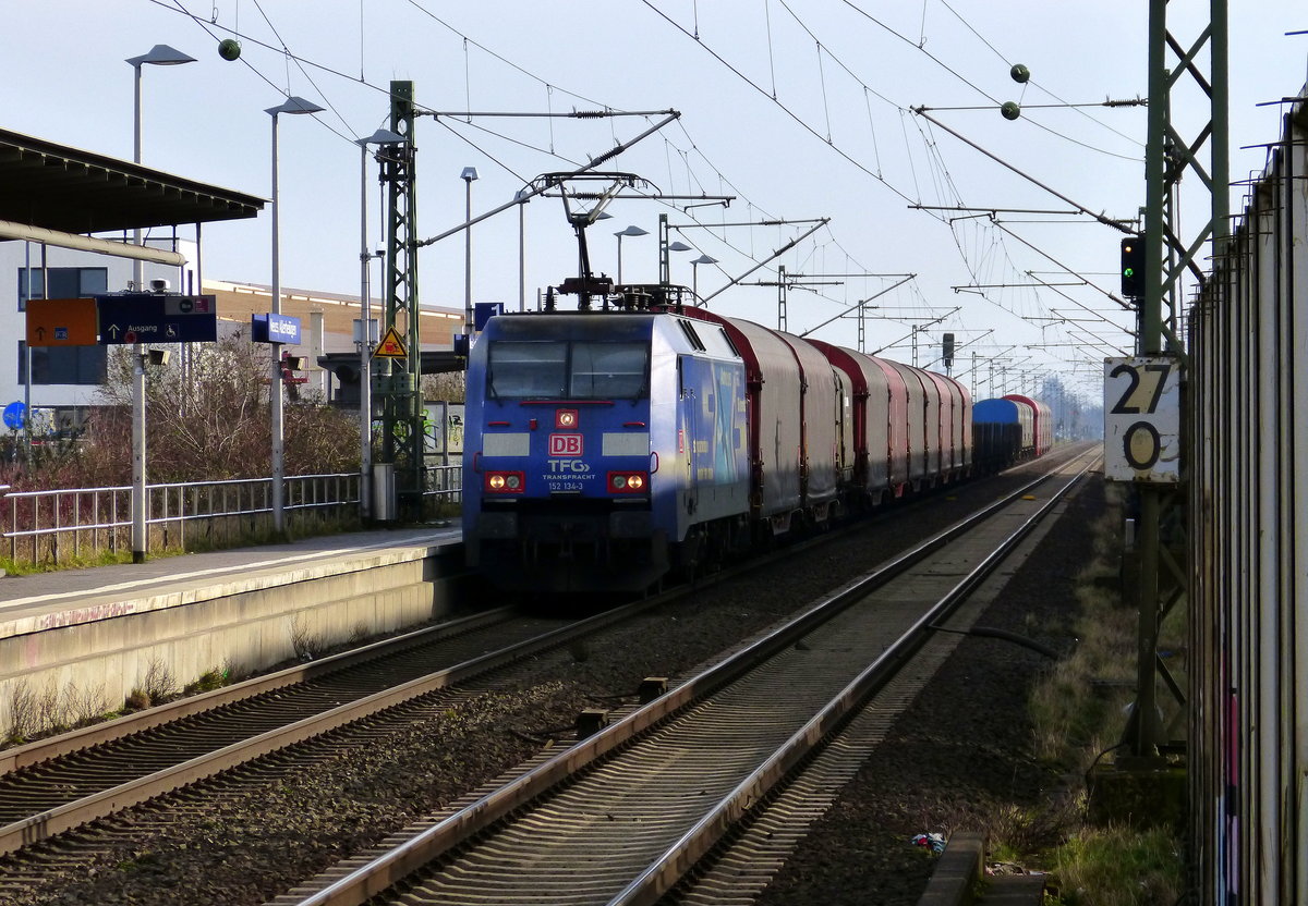 152 134-3 (DB/TFG-Transfracht) kommt mit einem Aluzug aus Nievenheim nach Göttingen und kommt aus Nievenheim und fährt durch Neuss-Allerheiligen in Richtung Norf,Neuss-Süd,Neuss-Hbf. Aufgenommen vom Bahnsteig 2 in Neuss-Allerheiligen.