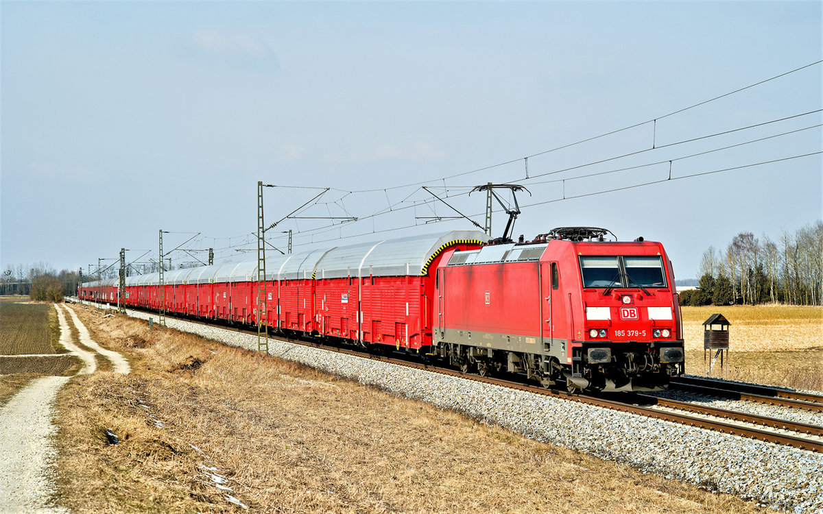 185 379-5 ist in Osterhofen mit einem Autotransportzug nach Süden unterwegs.Bild 27.2.2018