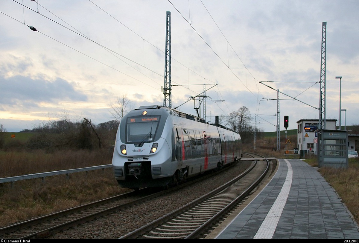 9442 620 (Bombardier Talent 2) von Abellio Rail Mitteldeutschland als RB 74784 (RB75) von Halle(Saale)Hbf nach Lutherstadt Eisleben steht im Hp Zscherben auf der Bahnstrecke Halle–Hann. Münden (KBS 590). [28.1.2018 | 16:51 Uhr]