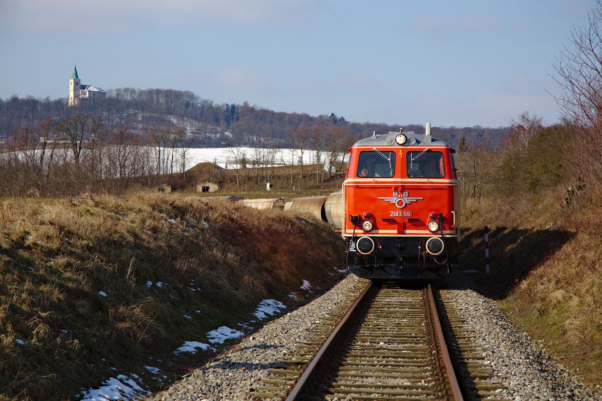 Selbst im Weinviertel ist es schwierig, einen Zug mit einem Weinkeller zu fotografieren. Bei der bestens organisierten Fotofahrt mit der frisch ausgebesserten 2143.070 + 2143.056 bot sich dazu eine endlich dazu eine tolle Gelegenheit, noch dazu bei perfektem Licht. (25.02.2017)