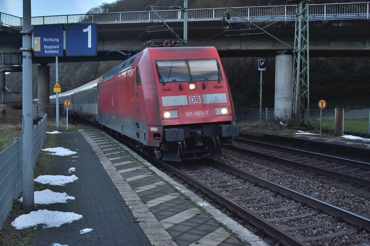EC 113 nach Münster bei der Durchfahrt in Hirzenach am Freitag den 16.2.2018 gezogen von der 101 005-7 an dem Abend.