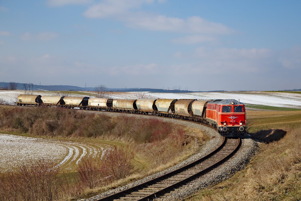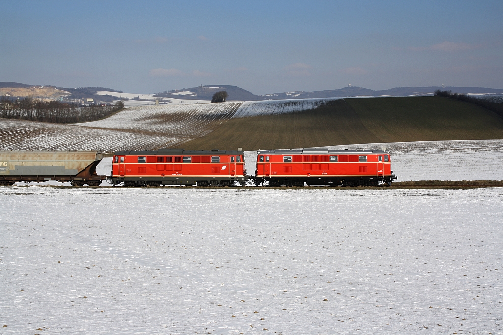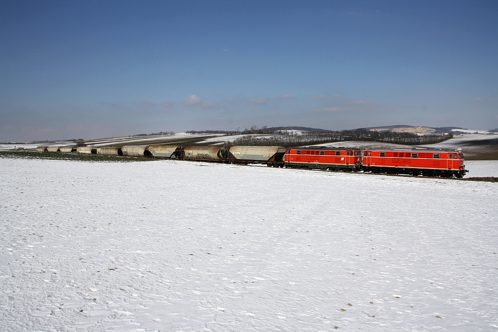2143.56 und 2143 070 vom Verein Neue Landesbahn am 25.2.2018 mit einem leeren Getreidezug von Korneuburg nach Ernstbrunn unterwegs, aufgenommen kurz nach Hetzmannsdorf.