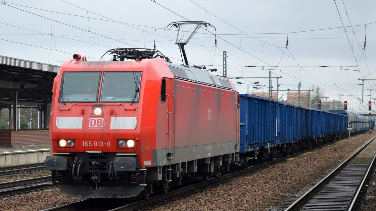 185 013-0 mit polnischen Güterwagen (für Kohltransport, leer) am 03.02.18 Durchfahrt Bf. Flughafen Berlin-Schönefeld.