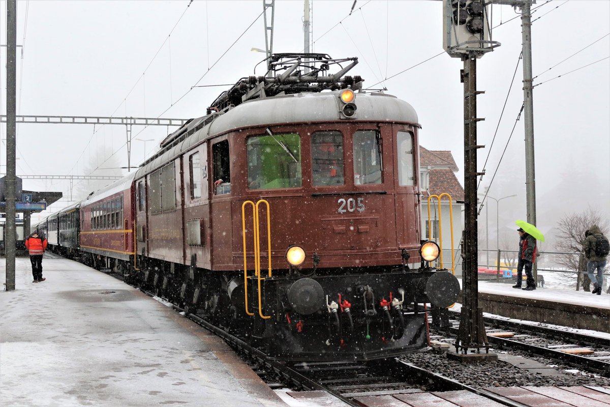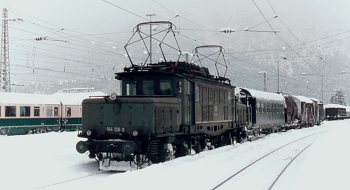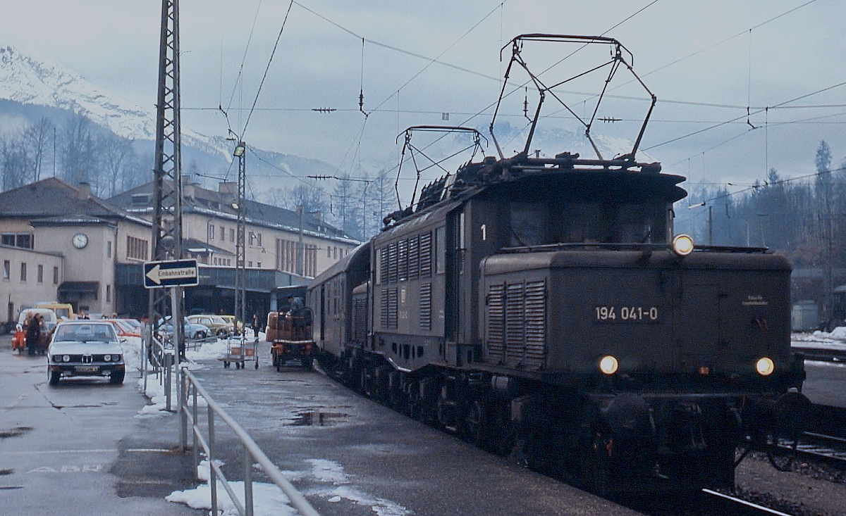Neben den E 44.5 wurden auch E 94 auf der Strecke Freilassing - Berchtesgaden eingesetzt. Am 24.12.1977 ist die 194 041-0 (KM/SSW 15810/1942) mit einem Nahverkehrszug in Berchtesgaden eingetroffen. Zu dieser Zeit war ein Gepäckwagen in solchen Zügen noch unentbehrlich. Die Lok gehörte zu den E 94, bei denen das Lokschild nicht mittig angebracht war, sie wurde 1987 ausgemustert und 1988 verschrottet.