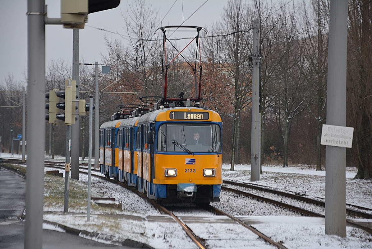 20.01.2016, Leipzig, Ratzelstraße. Tatra-Traktion endet die Fahrt auf der Linie 1.