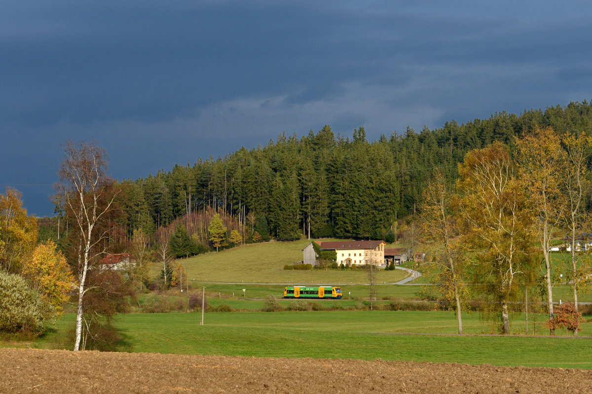 Blick in den Bahnhof As Mesto (Asch Stadt) im nördlichsten Zipfel Tschechiens. Ein Ferkeltaxi ist auf Sonderfahrt nach Hranice. Vor dem 2. WK ging diese Strecke ja weiter nach Adorf, das war der Grund der Befahrung. Hinter dem Baumstumpf konnte ich aus tiefster Position ein modernes Kfz fast verschwinden lassen...