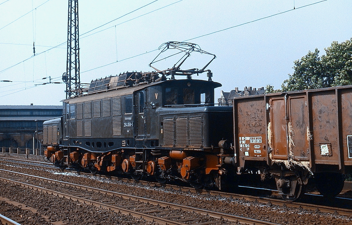 Das "Eisenschwein" 254 058-1 (AEG 5337/1942) vom Bw Leipzig-Wahren durchfährt im August 1977 den Bahnhof Dresden Mitte